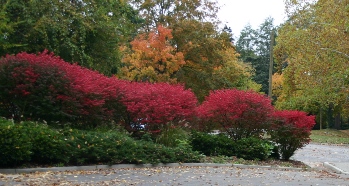 Observe fall foliage colors, so you can select plants you may want to add to your landscape. Plants like Japanese Maple and Burning Bush turn an eye catching red. Sugar maples turn a bright orangey yellow while oaks turn earthy burgundies and golds. Beautiful fall foliage adds wonderful color to your landscape like seen in this photograph of burning bush. Notice the sugar maple's fall colors in the background.