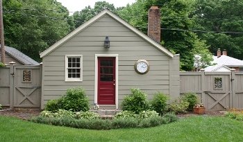 This client's shed is also used as an office. The paint color matches the fence and the nice details on it make it charming. This outbuilding is an asset to the property.