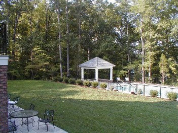 grow in, the pool will not be so obvious in the landscape. The view from this pool looks through the woods to a beautiful lake. The open design and non reflective surface of the black powder coated aluminum is the best choice for this property.